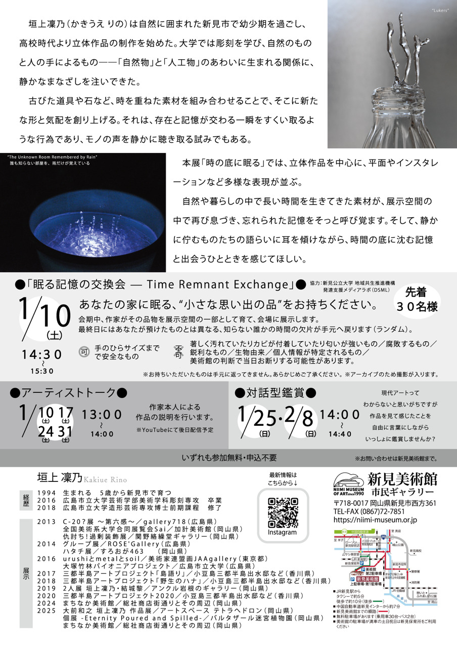 岡山県新見市を拠点に作家活動を行う垣上凜乃のインスタレーションを展示します。会期中には新見公立大学発達支援メディアラボの協力による「眠る記憶の交換会」やアーティストトーク、対話型鑑賞も実施します。