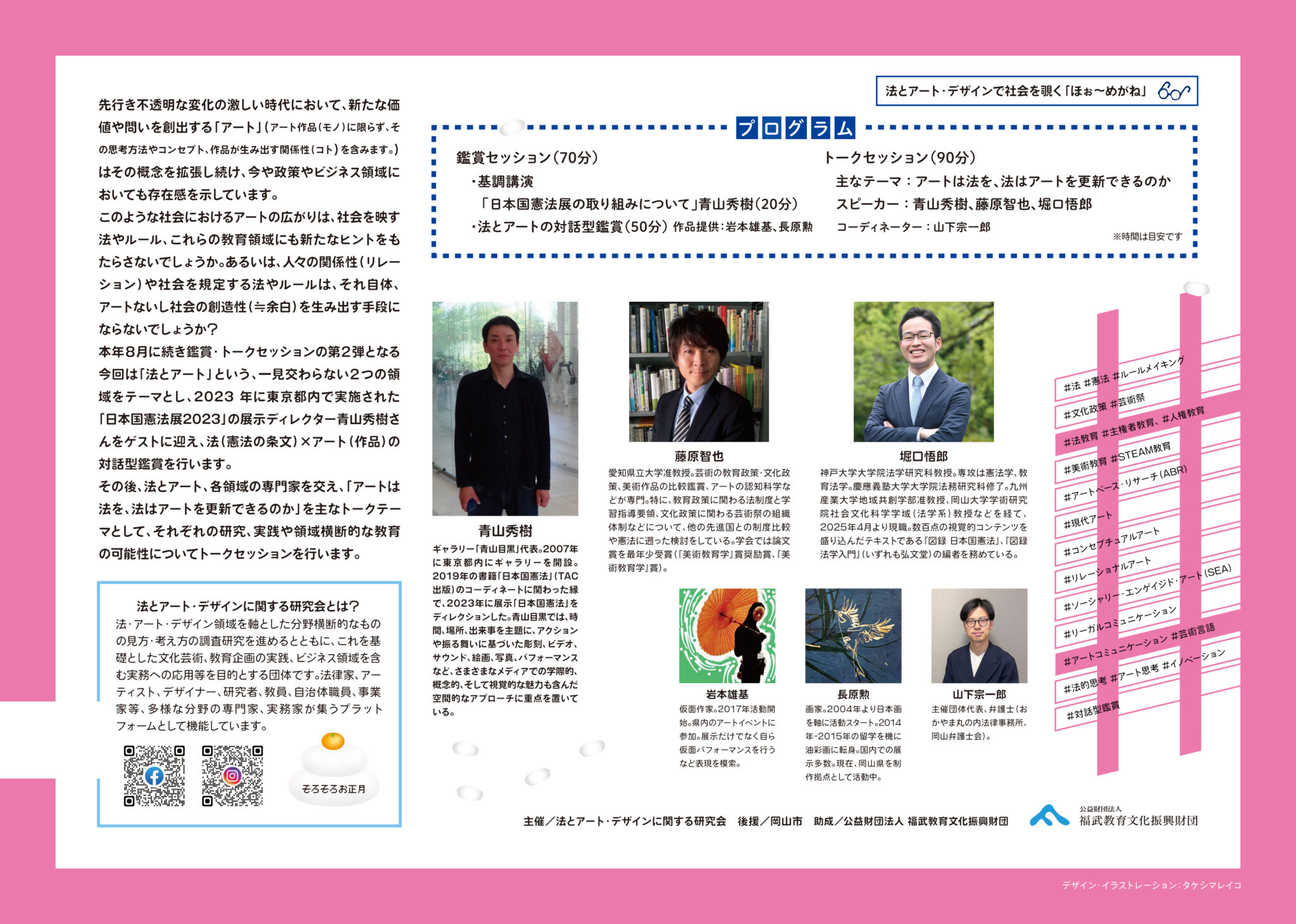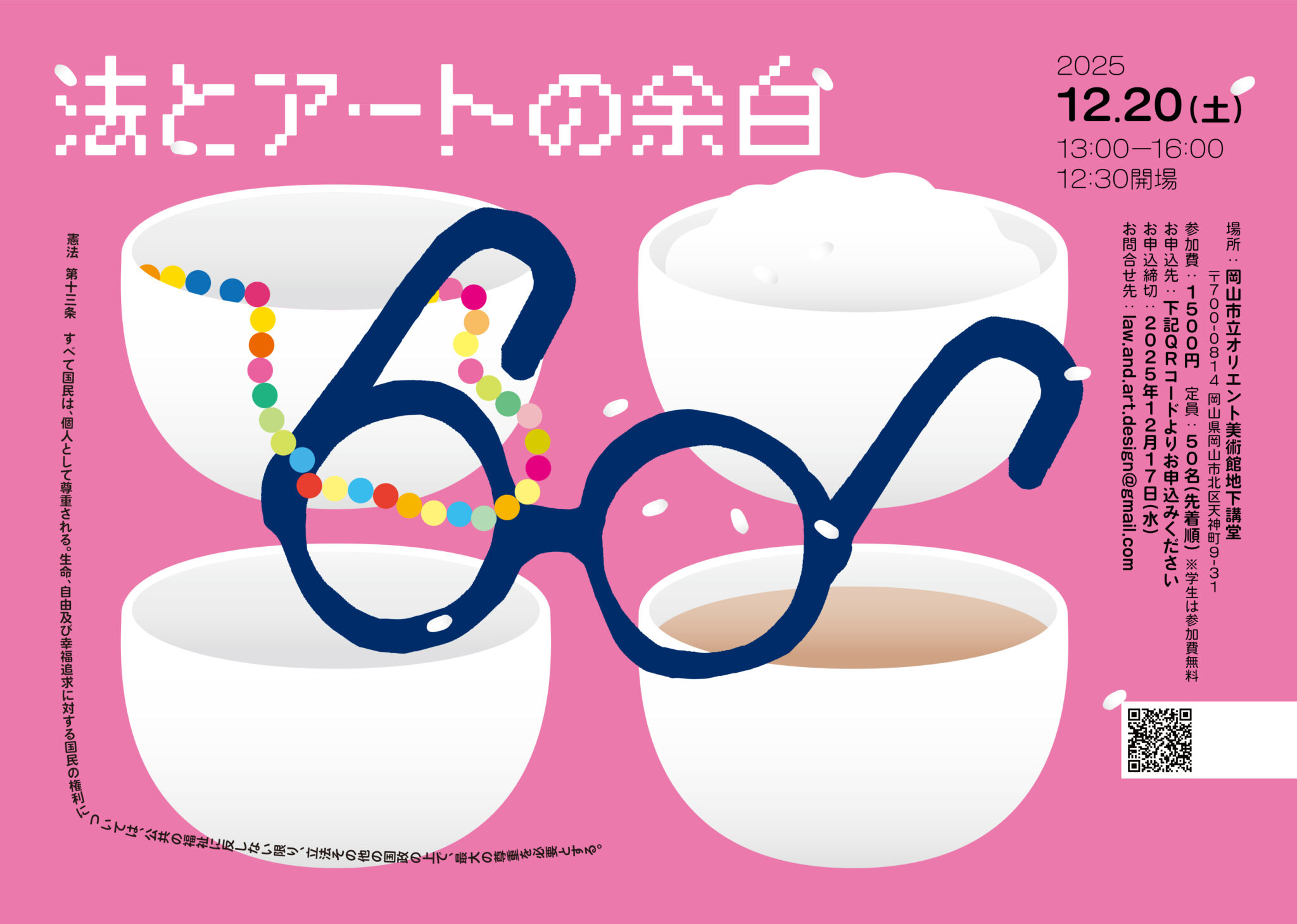 2023年に東京都内で実施された「日本国憲法展」のディレクター、美術及び法学の研究者をゲストに迎え、協力作家の作品をもとに、法×アートの対話型鑑賞を実施し、「アートは法を、法はアートを更新できるのか」等をテーマとして、ゲストらとのトークセッションを行います。