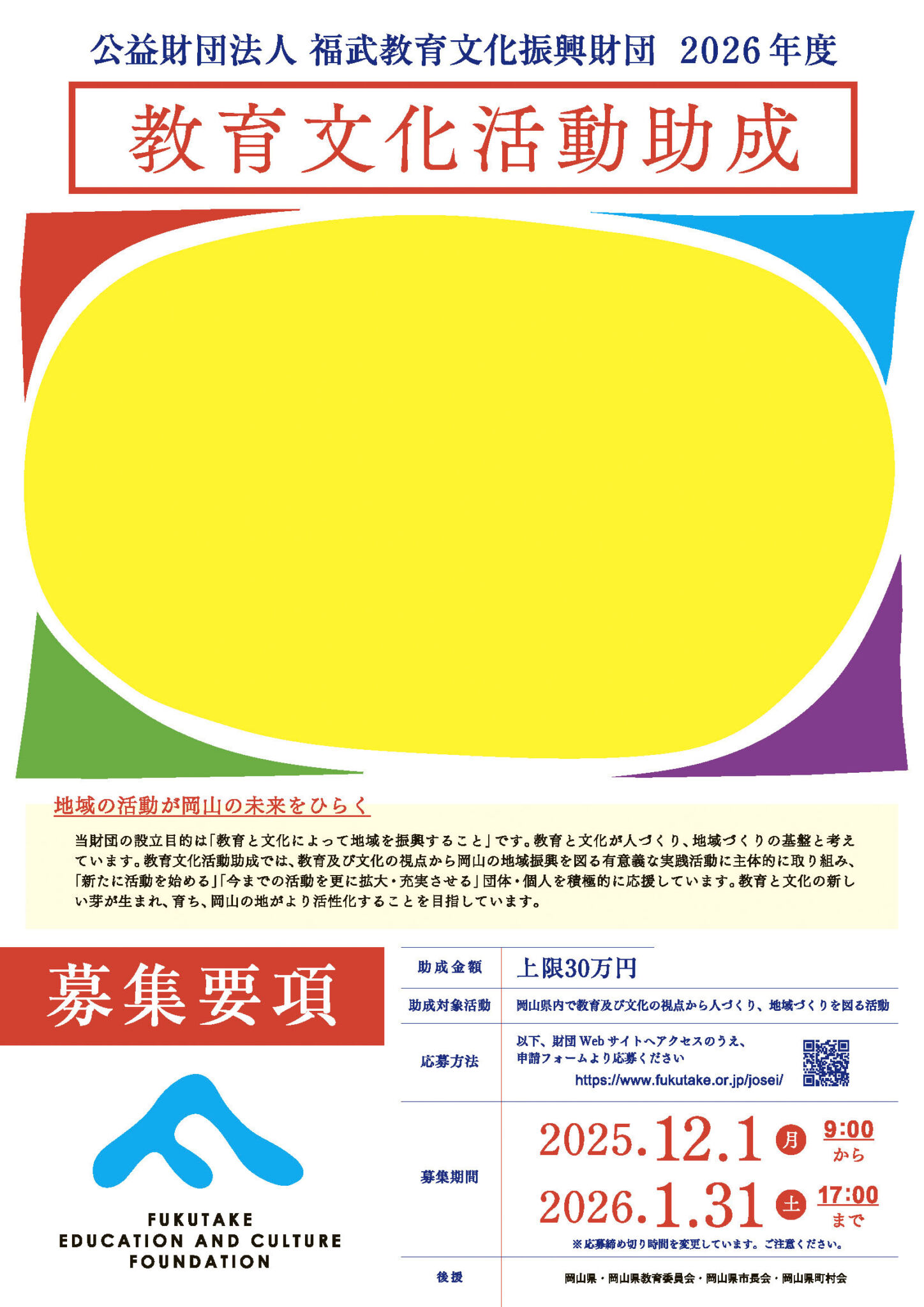岡山県内で上記の助成対象となる教育文化活動を行う団体・個人