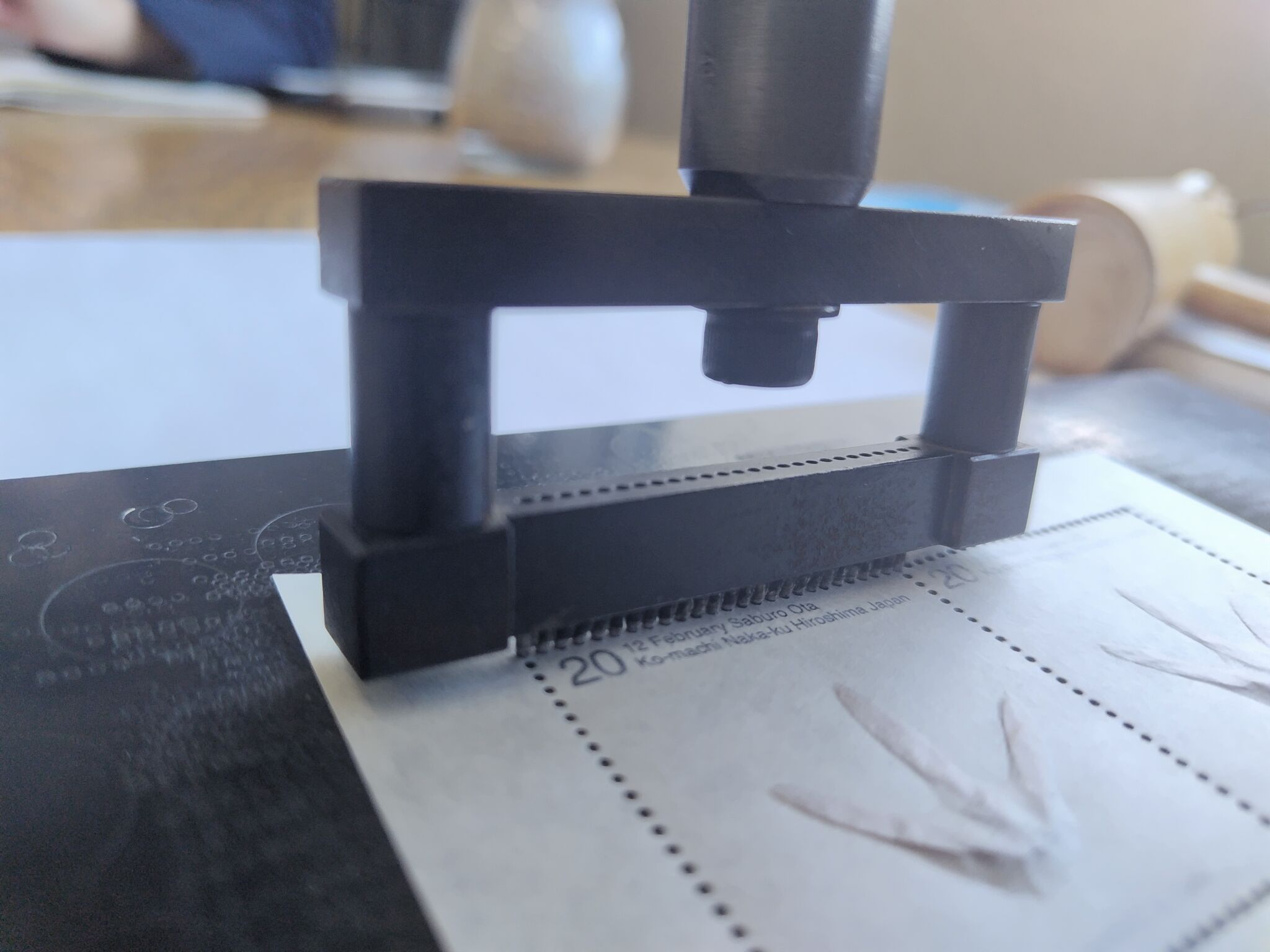 まるで本物のような、オリジナル切手の作品を制作している太田さん。津山市にある仕事場で、その作品づくりに欠かせないものを見せてもらいました。それが、切手の切り取り線として穴を空ける道具「ポンチ」です。1991年頃から使い始め、現在は3代目。表紙には1代目のイラストが描かれていて、歯が欠けたり錆びたりすると代替わりします。等間隔・縦一列に複数の穴を一度で空けられる、作品のための特注品です。浅草にあるポンチ製作所へ、太田さんが直接依頼して作ってもらっていました。鉄製のため、文鎮のような重さがあります。